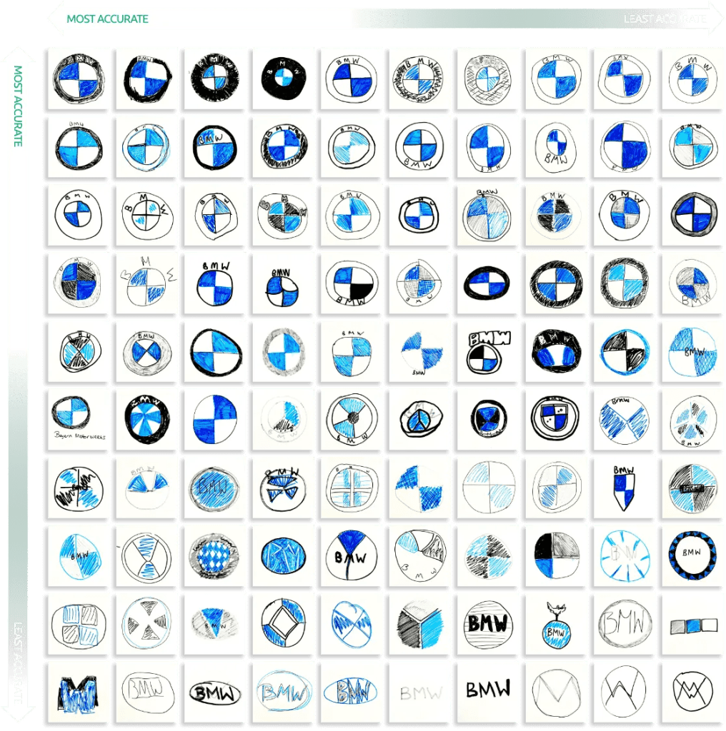 A very interesting study has been published in which 100 people were asked to draw the logos of 10 well-known automobile brands from memory, without being shown the actual logos. According to the results, 80% of participants correctly recalled the colors, 78% correctly recalled the shapes, while only 12% managed to accurately reproduce every detail of the logo.